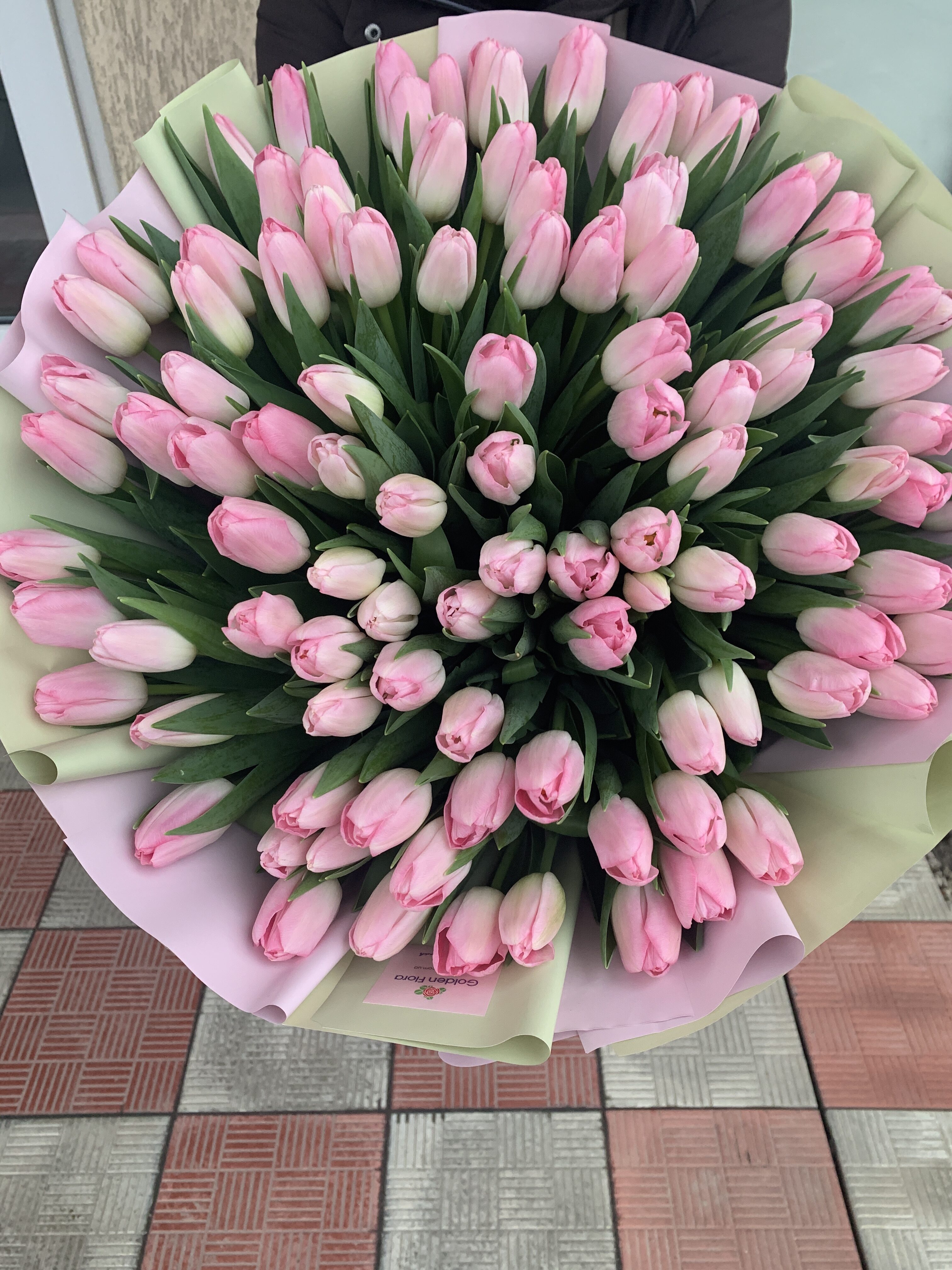 Букет зі 101 ніжно-рожевого тюльпана випромінює легкість і ніжність, а майстерне оформлення в дизайнерському папері додає урочистості. Загалом композиція створює відчуття весняного пробудження й тепла, а свіжі та ароматні тюльпани символізують любов, вдячність і гармонію, саме тому вони є доречним вибором для святкування дня народження чи, наприклад, ювілею. Втім, ці квіти — відмінний знак щирої уваги та ніжних почуттів.