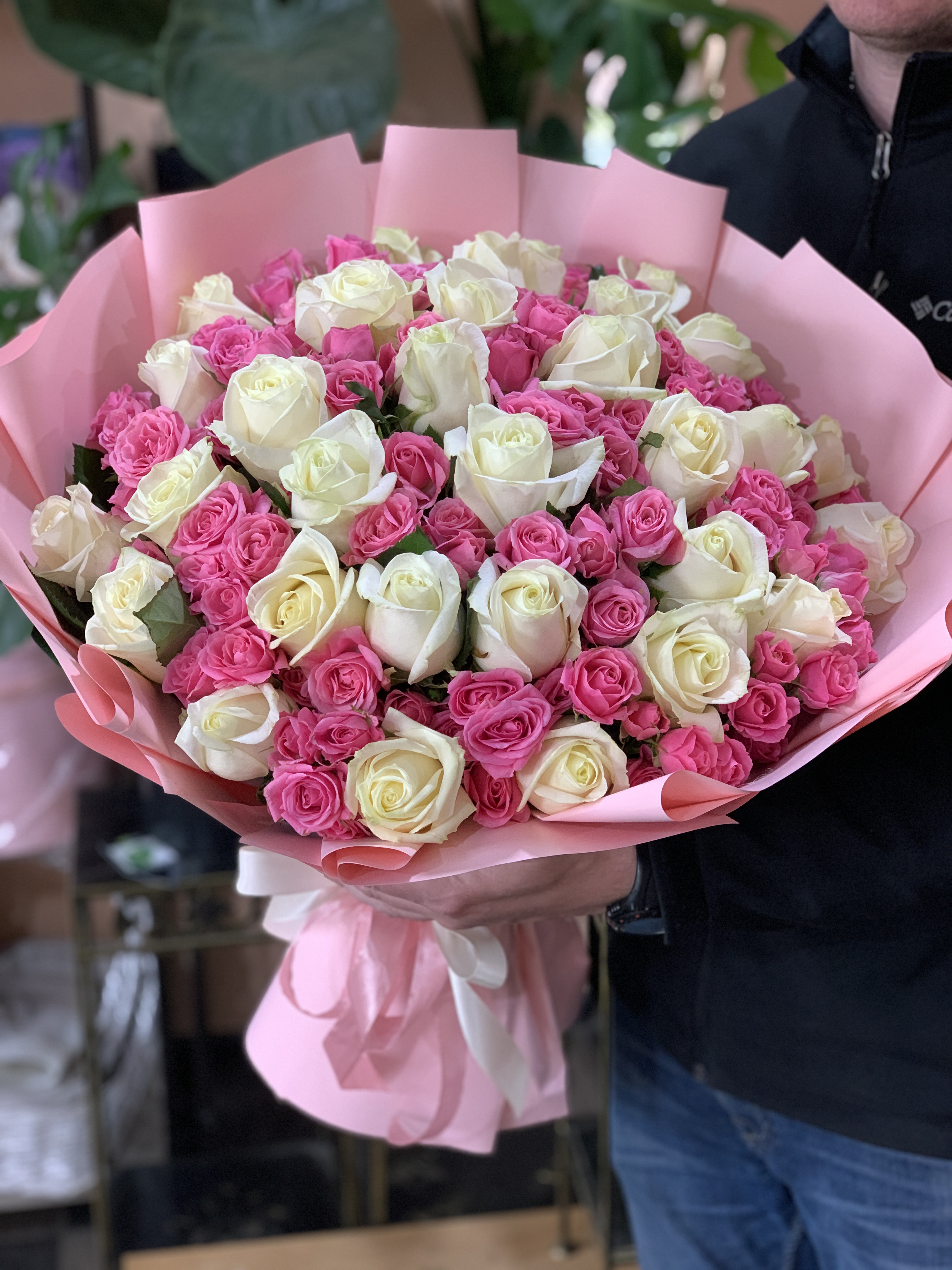Склад: біла троянда аволанч 60 см 31 шт, рожева троянда спрей 15 шт, декоративна упаковка